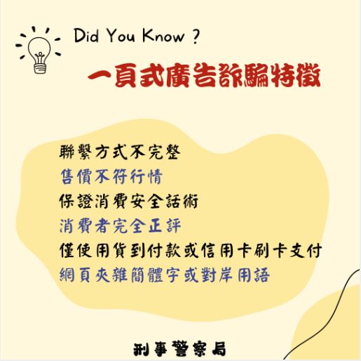 警方指出,一頁式廣告詐騙特徵包含網頁上無公司地址、客服電話,僅電子信箱或通訊軟體帳號,網頁大多為粗糙不精美或夾雜簡體字,售價明顯低於市場行情,常以限時或倒數方式吸引消費者,廣告底下留言都無負評,僅能以貨到付款或信用卡刷卡付款。