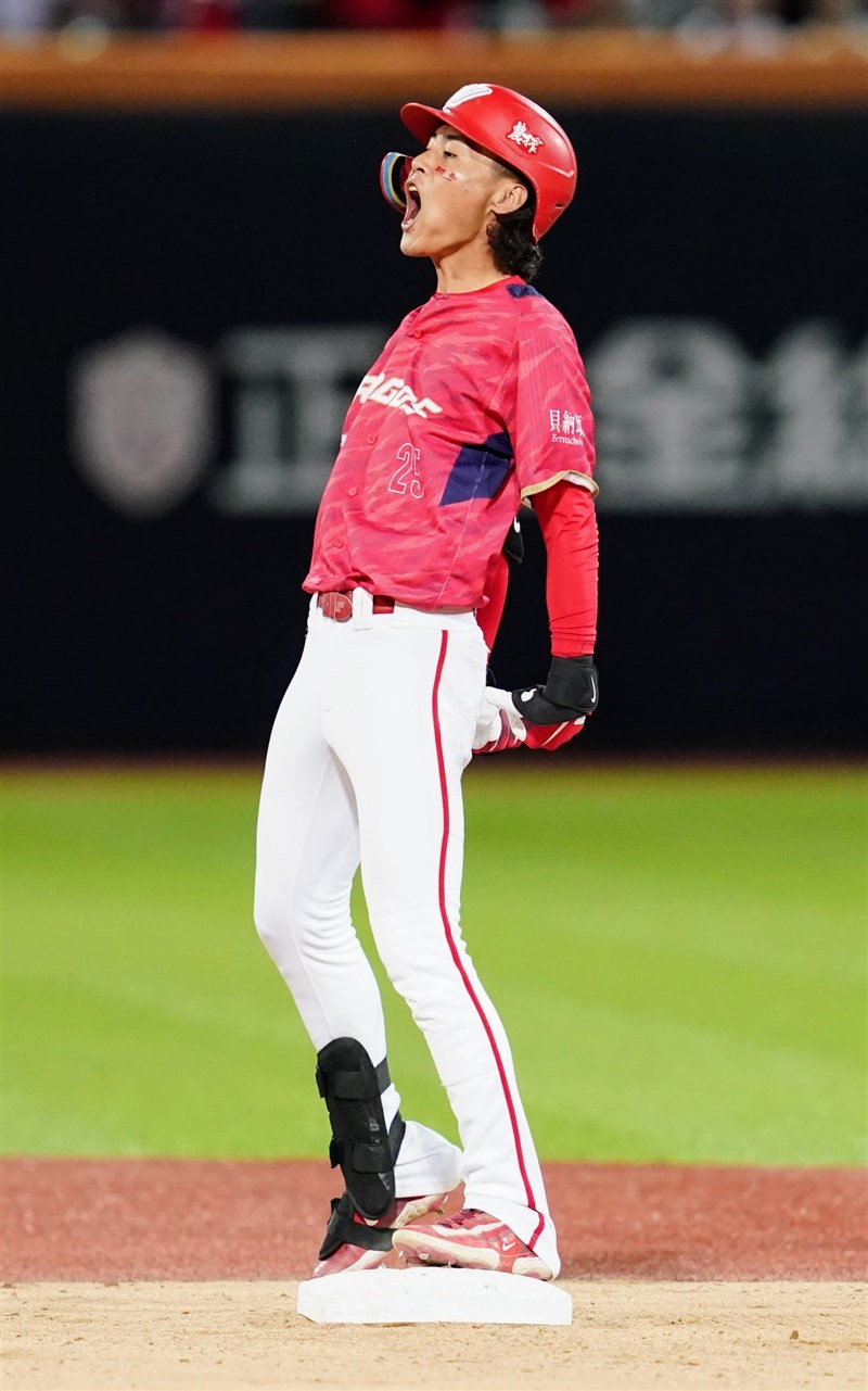 張政禹敲出長打後在二壘興奮地大吼。圖/味全龍提供
