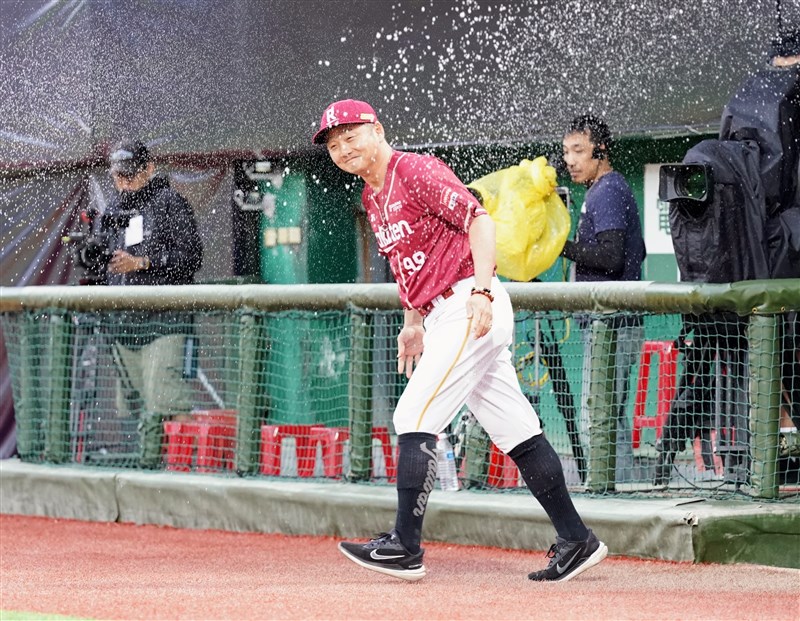 曾豪駒昨天賽前介紹出場時灑鹽登場。圖/樂天桃猿提供