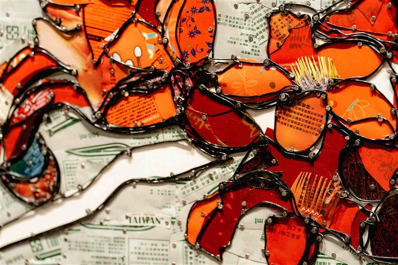 他努力蒐集顏色繽紛的鋁罐,按顏色做分類、拆剪及釘製,透過創意釘貼成各式的花朵、圖騰,幾乎每幅作品的創作都逾一個月的時間,他特別鐘情鋁罐上印有「Taiwan」字樣的鋁片並用於創作中,呈現獨特的台味風景。