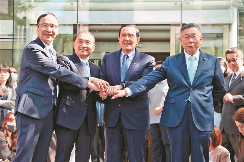 藍白合確定,國民黨主席朱立倫(左起)、國民黨總統參選人侯友宜、前總統馬英九與民眾黨總統參選人柯文哲握手,展現合作氛圍。
