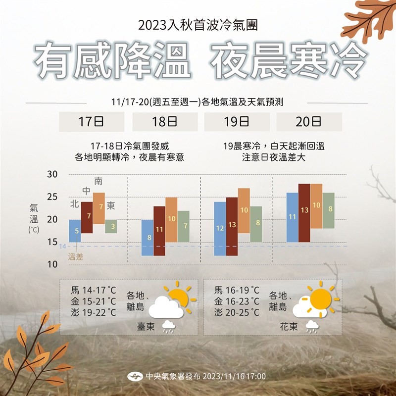 清晨中部以北及東北部氣溫15至17度,其它地區18、19度;白天苗栗以北及宜蘭、花蓮氣溫回升有限,整天偏冷。