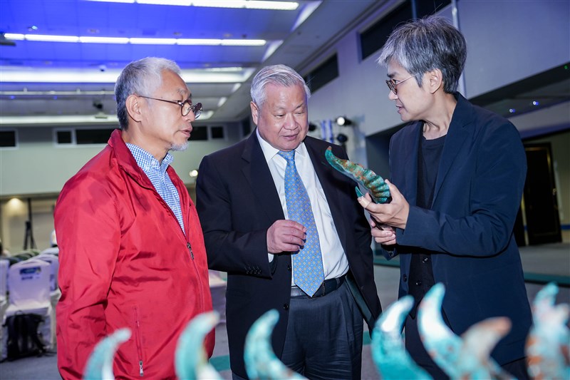 旺宏教育基金會董事長吳敏求(中)與基金會董事余燈銓,和獎座藝術家趙丹綺交流分享獎座設計概念。圖/旺宏教育基金會