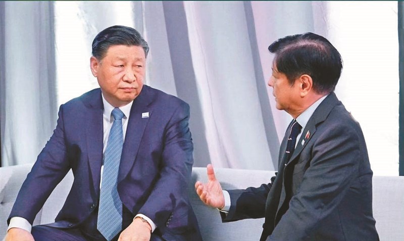 菲律賓總統小馬可仕(右)與大陸國家主席習近平(左)在APEC場邊會談,討論建立舒緩南海緊張局勢機制。