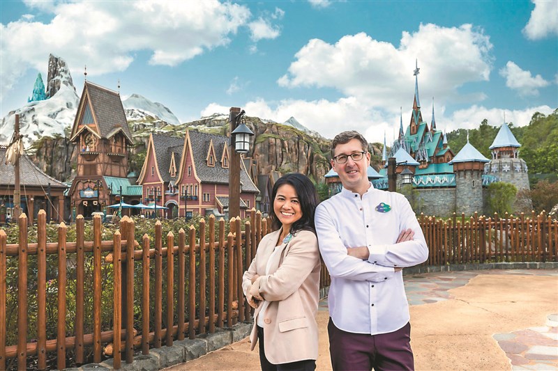 園區各處更是充滿《冰雪奇緣》設計的細節。兩人透露,光是找出在「友誼噴泉」、「冰雪皇宮」與城堡頂端處,以及艾莎使用「冰魔法」變出的半透明、保有冰紋理的結晶,團隊就耗時3年進行無數模型和材質測試。