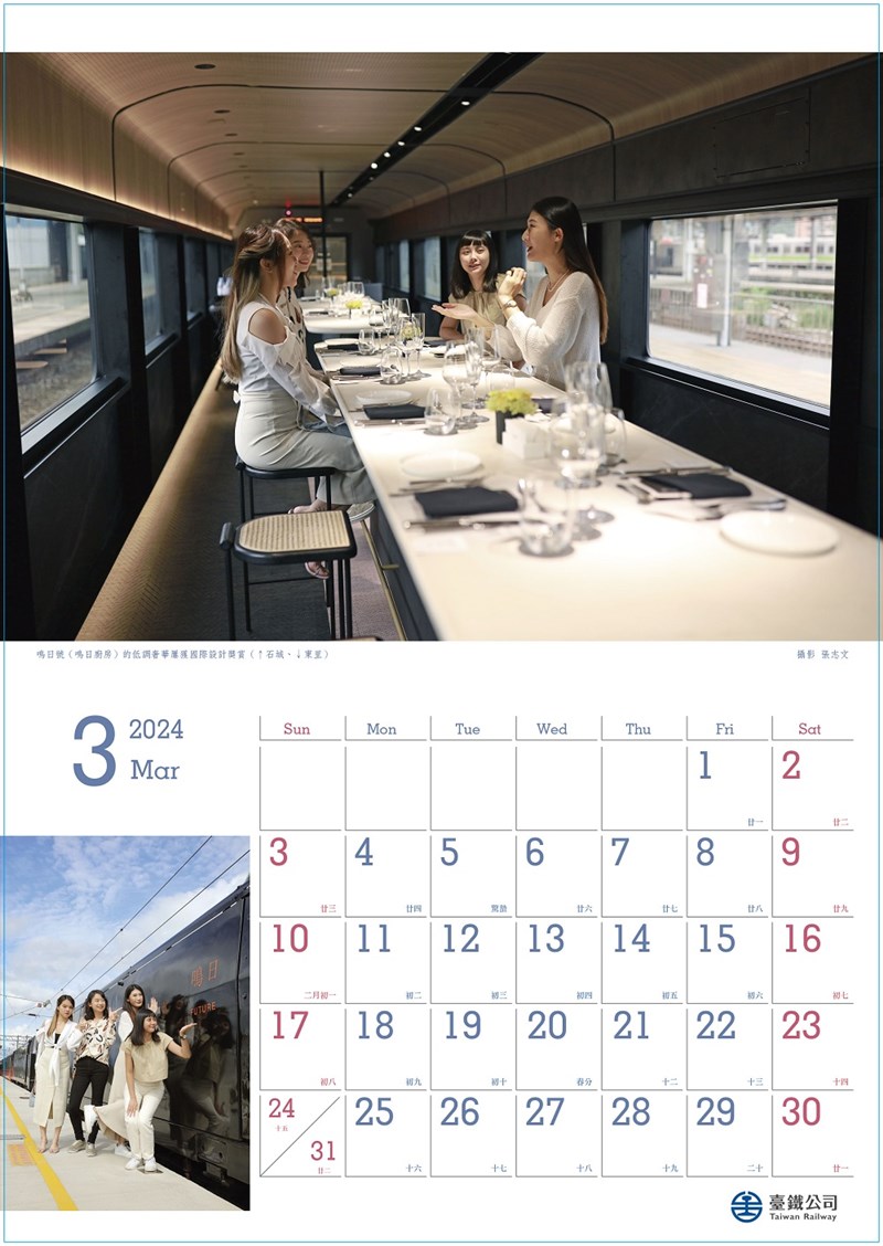 台鐵局表示,2024年「華麗轉身 永續台鐵」桌曆集結台鐵現行各式主力車款,包含城際列車、區間運輸、貨運輸送、鐵道觀光,並呈現台鐵多元化服務;2024年「台鐵新旅」月曆以推廣鐵道觀光為主軸,精選季節限定仲夏寶島號、呼朋引伴觀光列車、懷舊藍皮列車、探索支線秘境、兩鐵行旅等。