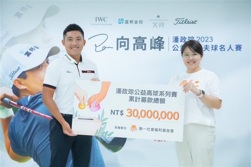 高球好手潘政琮(左)自2015年開始造訪第一社福,迄今已累計捐款達3千萬元,由第一社福張菁倫執行長代表致謝。圖/第一社福提供