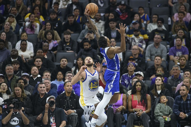蒙克(藍衣)準絕殺柯瑞(白衣)領軍的勇士,也幫國王打進季中錦標賽8強。圖/美聯社