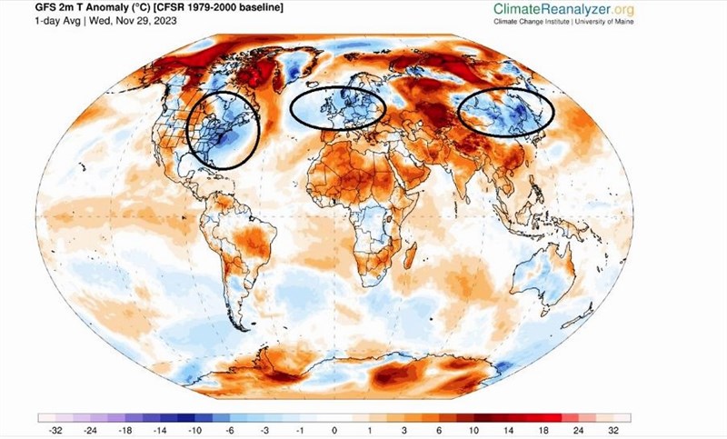 中央氣象局前局長鄭明典今天在臉書貼出全球最近一天的氣溫距平圖,他指出,可以看到北半球很多地方明顯偏暖(紅棕色),但有3股相對冷的空氣在中緯度流竄(藍色)。