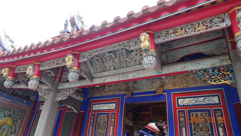 張廖家廟的整體木結構上彩繪、屋樑上,還裝飾有造型奇特的獅座,以及藍漆圓窗灰色條紋的萬字圖案,呈現出調和樸拙的建築藝術風格。圖/文化資產處提供
