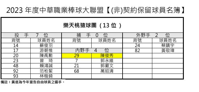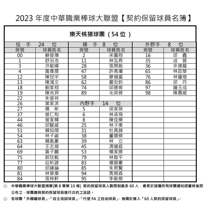 中職/桃猿昔日連霸主力 3人未列入60人名單 曾博群 |2023.11.30 語音朗讀 10038觀看次 字級 大 中 小 陳禹勳。圖/陳正興 【記者曾博群台北報導】中華職棒聯盟今日公布各隊60人契約保留名單,連兩年進軍總冠軍賽的樂天桃猿,只繳交54人名單,陳禹勳、郭嚴文、郭永維都沒有被保護,再加上自由球員陳俊秀在內,共有13名球員未被列入。樂天桃猿非60人名單中,有蘇俊羽、游朝惟、陳禹勳、曾琦、賴鴻誠、范柏絜、林楷錡、郭永維、郭嚴文、萬昭清、蔡鎮宇、黃敬瑋;其中陳禹勳、郭永維、郭嚴文都是過去Lamigo時期連霸的主力陣容選手。圖/中職聯盟提供根據中職規章規定,球季結束後各隊要提出「契約保留球員名簿」,限額60人,名單外的選手得在不經原球團同意之情況下,與其他球團逕行接觸並洽談合約,另外統一獅隊同樣13人未列入,味全龍隊、富邦悍將隊11人第三多,中信兄弟隊7人排第五,其中包含自由球員及宣告引退球員。圖/中職聯盟提供 前一篇文章 電信合併將生效!用戶權益一次看 下一篇文章 中職/統一獅60人名單沒高國慶 將轉任教練 熱門新聞 01補充纖維、鈣、鎂、鉀 預防多種疾病風險2025.11.1102印尼佛教大學、佛光山叢林學院 簽MOU2025.11.1203【遊藝筆記】 天涯海角一坡翁2025.11.1104多倫多佛光山 獲頒建築文化遺產獎2025.11.1205攝影師造池塘 重建沙漠生機2025.11.1106【臆想截圖】 蔥蘭今生與來世2025.11.1107比利時國小師生 靜坐、抄心經2025.11.1108【論愛談情】愛,無須卑微2025.11.1109修行入廚慈悲入味 台韓寺剎飲食交流2025.11.1210鳳凰颱風來襲 桃園、宜花、澎湖今停班停課2025.11.11 訂閱電子報 台北市 天氣預報 台灣一週天氣預報 相關報導 兩岸、日韓關係牽扯 韓黑鷹特技小組 缺席杜拜航展台中甲埔大道 明年首季通車川普第2任期 首軍售台102億M1A2T將納入國軍指管系統修舊如舊 瑞三礦業整煤廠再生通霄電廠閃鳳凰 大煙囪「放倒」 作者其他文章華文文學星雲獎 隱地獲貢獻獎台灣永續行動獎 人間福報獲金、銅獎工研院攜故宮 用AI秀經典名畫防腐劑、汽機車廢氣 罹患肺腺癌關鍵因子社會光明面報導獎揭曉 參賽數創高中美角力 8 國學者共商競合出路