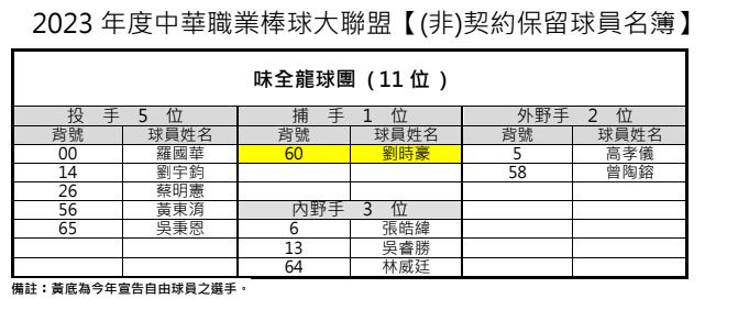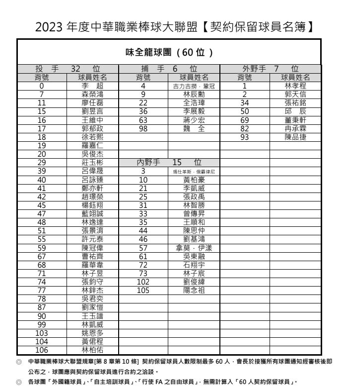 中職/龍隊60人名單公布 曾陶鎔未入列 曾博群 |2023.11.30 語音朗讀 767觀看次 字級 大 中 小 味全龍曾陶鎔。圖/陳正興 【記者曾博群台北報導】中華職棒2023年度總冠軍味全龍隊,今日公布的60人保留名單中,包含自由球員劉時豪、日前引退的高孝儀在內,共有11名球員未被列入,人數是6隊中次多,奪冠主力以及潛力新秀大多在名單內。味全龍未被列入60名單中的,包含羅國華、劉宇鈞、蔡明憲、黃東淯、吳秉恩、張皓緯、吳睿勝、林威廷、曾陶鎔。其中羅國華、曾陶鎔是名單中少數一軍出賽數較多的資深選手,吳秉恩則是昔日名門平鎮高中的王牌投手,但進入職棒3年來只在二軍出賽11場。圖/中職聯盟提供根據中職規章規定,球季結束後各隊要提出「契約保留球員名簿」,限額60人,名單外的選手得在不經原球團同意之情況下,與其他球團逕行接觸並洽談合約。不在名單內的球員非釋出,可再與原球隊重新議約或轉職。圖/中職聯盟提供 前一篇文章 中職/統一獅60人名單沒高國慶 將轉任教練 下一篇文章 中職/兄弟7人不在60人名單5隊最少 雄鷹全員保留 熱門新聞 01印尼佛教大學、佛光山叢林學院 簽MOU2025.11.1202多倫多佛光山 獲頒建築文化遺產獎2025.11.1203修行入廚慈悲入味 台韓寺剎飲食交流2025.11.1204【快樂塗鴉簿】夢幻鳥2025.11.1205佛光會參與COP30 推廣環保與心保2025.11.1306【練瑜伽品生活】橋式 簡單動作不簡單2025.11.120795歲巴菲特發告別信:將歸於沉寂2025.11.120818年首訪陸 西班牙國王今晤習近平2025.11.12093國寶畫故宮南院合體 僅限42天 2025.11.1210法華禪寺皈依典禮 佛子開啟修行旅程2025.11.13 訂閱電子報 台北市 天氣預報 台灣一週天氣預報 相關報導 兩岸、日韓關係牽扯 韓黑鷹特技小組 缺席杜拜航展台中甲埔大道 明年首季通車川普第2任期 首軍售台102億M1A2T將納入國軍指管系統修舊如舊 瑞三礦業整煤廠再生通霄電廠閃鳳凰 大煙囪「放倒」 作者其他文章華文文學星雲獎 隱地獲貢獻獎台灣永續行動獎 人間福報獲金、銅獎工研院攜故宮 用AI秀經典名畫防腐劑、汽機車廢氣 罹患肺腺癌關鍵因子社會光明面報導獎揭曉 參賽數創高中美角力 8 國學者共商競合出路