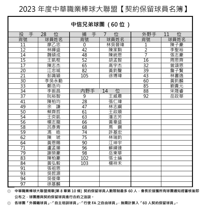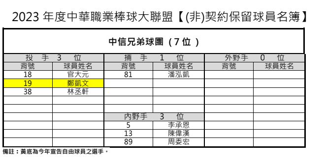 中職/兄弟7人不在60人名單5隊最少 雄鷹全員保留 張哲郢 |2023.11.30 語音朗讀 846觀看次 字級 大 中 小 官大元因引退也不在球員60人名單中。圖/資料照 【記者張哲郢綜合報導】中華職棒各隊今天公布各隊60人名單,今年在一軍5支球隊就屬中信兄弟7人不在60人名單內最少,當中還包含提出自由球員資格的鄭凱文,以及宣布引退的官大元。兄弟7名不在60人名單的球員包括官大元、鄭凱文、林丞軒、潘泓凱、李承恩、陳偉漢、周委宏等人,其中官大元之前宣布引退,鄭凱文則已提出申請成為自由球員。圖/中職聯盟提供剩餘名單中,陳偉漢是這次不在兄弟60人名單中一軍資歷最豐富,在一軍有191場出賽,生涯打擊率達2成76,不過兄弟年輕內野好手輩出,讓他今年整季沒一軍出賽機會,去年也只有15場一軍出賽機會。至於明年要登上一軍的台鋼雄鷹,旗下球員包含周二剛選來的5名擴編選秀球員,總計57人皆獲保留,無人在60人名單外。圖/中職聯盟提供 前一篇文章 中職/龍隊60人名單公布 曾陶鎔未入列 下一篇文章 健保明年總預算8755億元 未來費率不調整 熱門新聞 01印尼佛教大學、佛光山叢林學院 簽MOU2025.11.1202多倫多佛光山 獲頒建築文化遺產獎2025.11.1203修行入廚慈悲入味 台韓寺剎飲食交流2025.11.1204【快樂塗鴉簿】夢幻鳥2025.11.1205【練瑜伽品生活】橋式 簡單動作不簡單2025.11.120695歲巴菲特發告別信:將歸於沉寂2025.11.1207佛光會參與COP30 推廣環保與心保2025.11.130818年首訪陸 西班牙國王今晤習近平2025.11.12093國寶畫故宮南院合體 僅限42天 2025.11.1210法華禪寺皈依典禮 佛子開啟修行旅程2025.11.13 訂閱電子報 台北市 天氣預報 台灣一週天氣預報 相關報導 兩岸、日韓關係牽扯 韓黑鷹特技小組 缺席杜拜航展台中甲埔大道 明年首季通車川普第2任期 首軍售台102億M1A2T將納入國軍指管系統修舊如舊 瑞三礦業整煤廠再生通霄電廠閃鳳凰 大煙囪「放倒」 作者其他文章中華隊第8金 健力世錦賽 楊森包辦1金1銀1銅射箭亞錦賽 戴宇軒、李彩綺混雙摘金戴資穎高掛球拍 羽壇傳奇謝幕中華隊累計7金7銀5銅 健力世錦賽 江凱傑硬舉摘金 球星陳傑憲出書 盼助人跨過低潮健力世錦賽 中華隊再奪3金