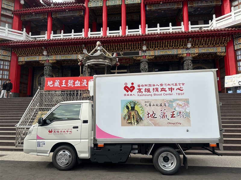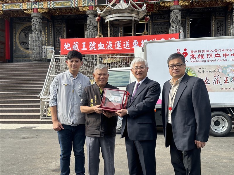 九華山地藏庵董事長黃俊森(左2)代表捐贈「地藏王號」給台灣血液基金會高雄捐血中心。圖∕嘉義市政府提供