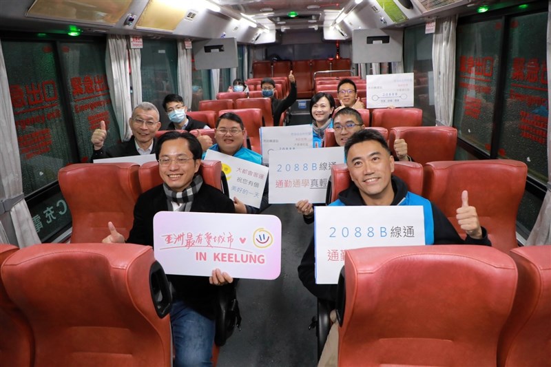 基隆快捷公車2088今增B線,通勤、通學民眾及學生稱很方便,市長謝國樑(右3)搭車體驗。圖/基隆市政府提供