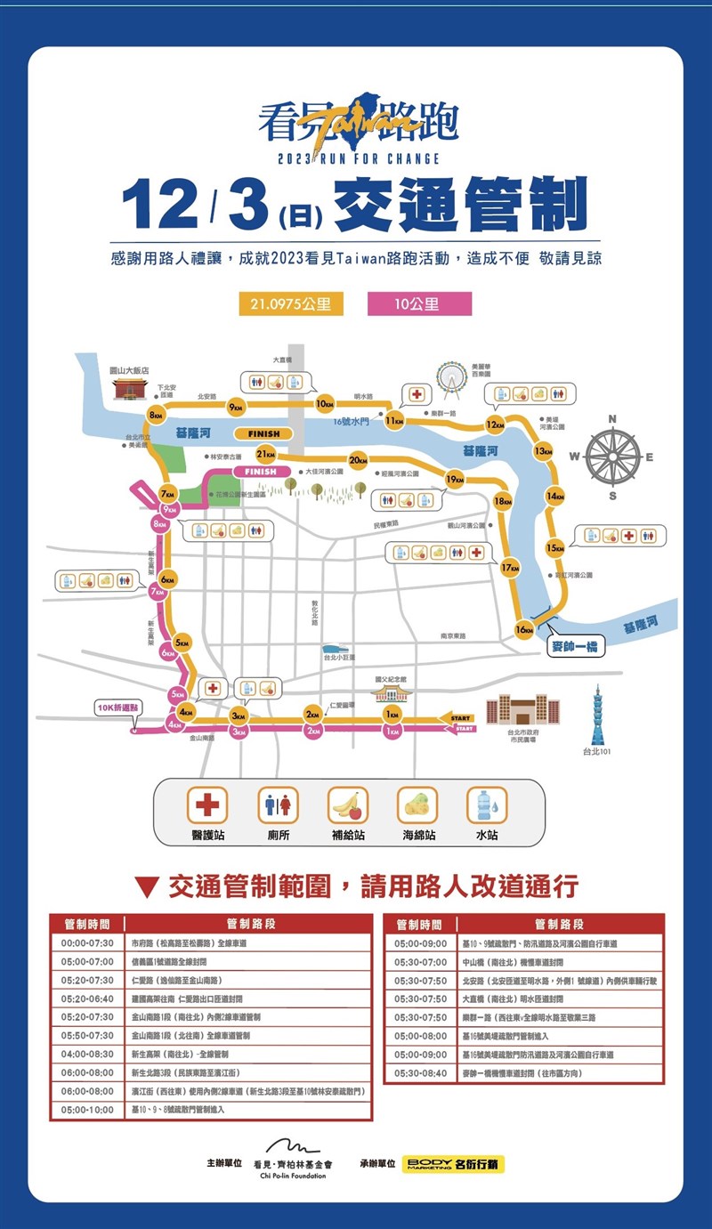 警方表示,活動期間賽道沿線實施交通管制,禁止車輛通行,管制範圍內公車候車處暫停服務,要查詢公車改道路線,可至北市公共運輸處官方網站。