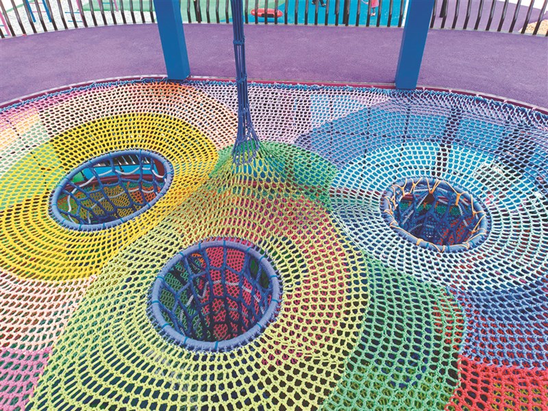 公園內大型攀爬網上有類似吊床的設計,可提供肢體較弱的小朋友作為歇腳處,透過遊戲帶來互動、鍛練肌耐力。圖為樹林東昇公園內的攀爬網。圖/新北市景觀處提供