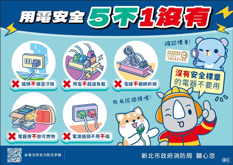 新北市消防局長李清安表示,民眾除了平時要養成良好的用電習慣外,應定期檢查臥室及客廳使用電氣安全,家中每個居室均應安裝住警器,住家如為透天厝或有長者或身心障礙者應安裝連動式住警器,於火災發生初期即時發出警報提醒民眾加速逃生及應變。