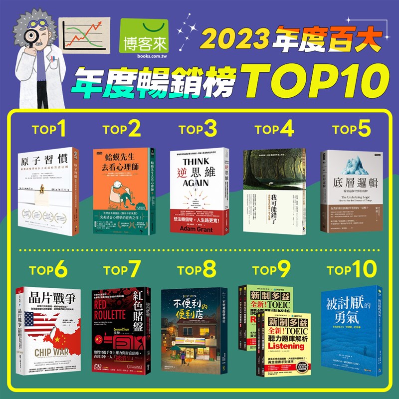 博客來表示,「2023年度閱讀暢銷總榜TOP10」中涵蓋商業理財、心理勵志、人文社科、文學小說、語言學習五大類,顯示多樣化的閱讀趨勢,其中習慣養成實作指南《原子習慣》連續第4年蟬聯中文書暢銷總榜冠軍,成為5年來最熱銷的書籍。