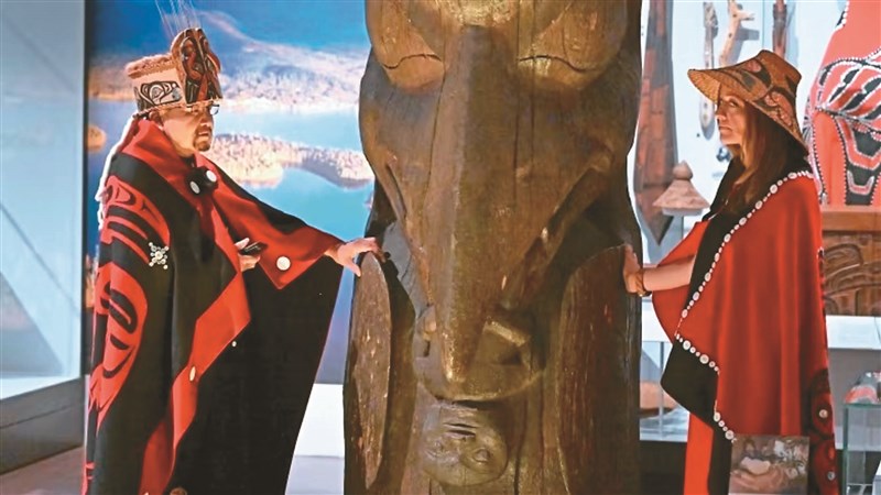 尼斯加部落的酋長史蒂文斯(左),觀賞尼斯加圖騰柱。圖/CBC