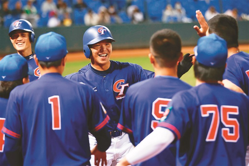 廖健富(中)在首局敲出兩分砲,是本屆亞錦賽中華隊的第一轟。