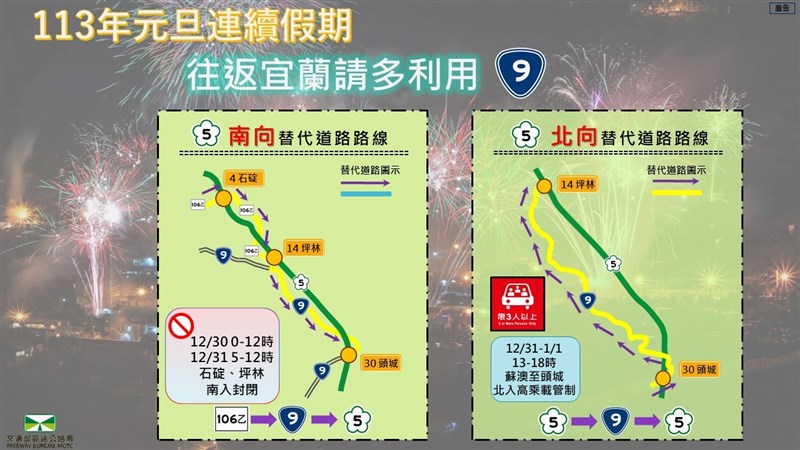 高公局依大數據資料分析研判,元旦連假前一日上午9時至晚間12時、連假首日上午5時至下午4時、第2日上午6時至下午3時國5南向南港系統至頭城;第2日上午11時至晚間12時及收假日上午9時至晚間8時國5北向宜蘭至坪林等路段,車速將低於每小時40公里,行車時間恐將為平常的5至7倍。