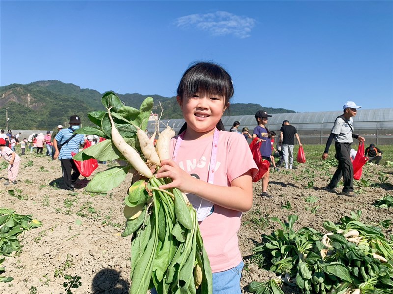 美濃農會舉辦白玉蘿蔔季,遊客下田採收蘿蔔。圖/宋原彰