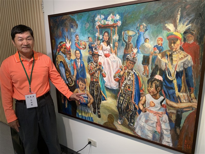 李學富的「生命之歌」是追憶好友驟逝,於是他透過畫作抒發心情,一幅以黃、橘色為背景的雲彩,是映照人生的黃昏歲月。