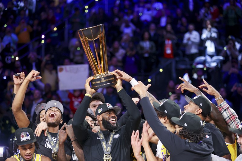 湖人奪得季中錦標賽冠軍,詹姆斯(中)獲選季中錦標賽MVP。圖/美聯社