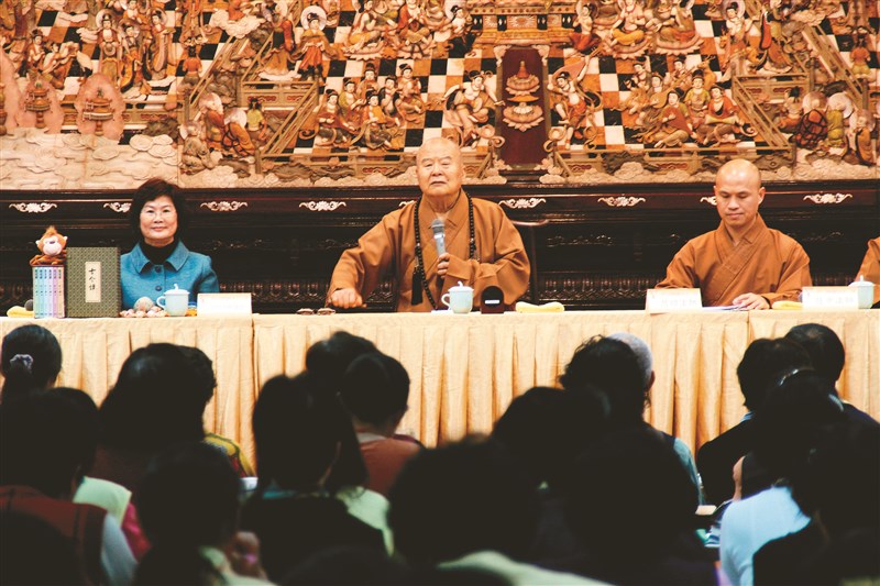 2007年1月20日,星雲大師(中)於佛光山傳燈樓集會堂為各大專校院香海社團學生開示接心,時任佛光山禪淨法堂堂主慧昭法師(右)、莊月香(左)等列席。圖/資料照片