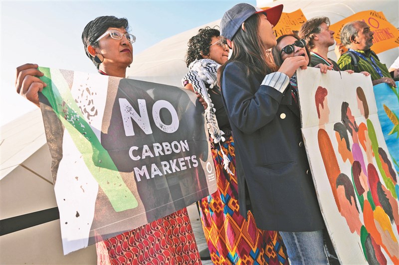 COP28峰會對「逐步淘汰」化石燃料意見兩極,協議陷入難產。圖為峰會場邊的「沒有碳交易市場」標語。圖/美聯社