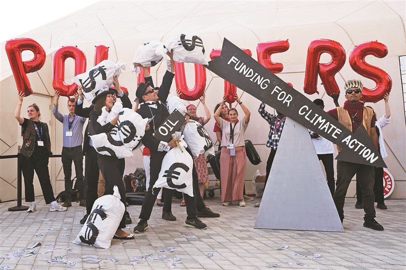 COP28峰會對「逐步淘汰」化石燃料意見兩極,協議陷入難產。圖為環保人士抗議化石燃料。圖/美聯社