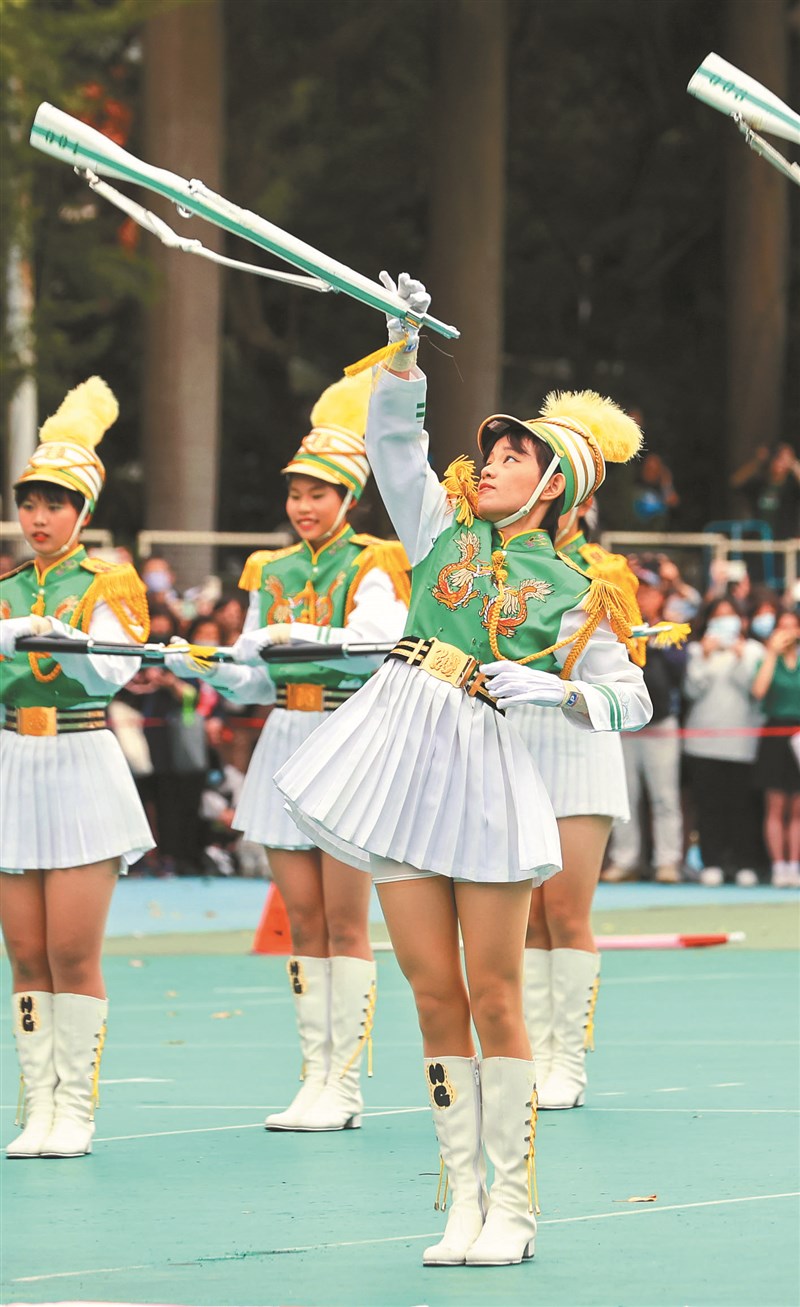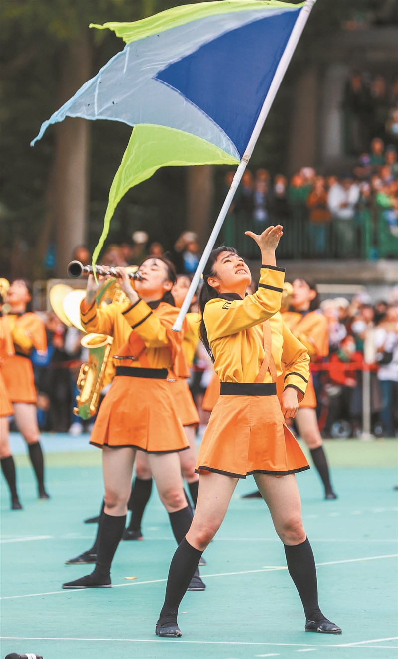 北一女中昨天上午慶祝120周年校慶,邀請日本京都橘高校吹奏部與北一女中樂儀旗隊,以表演交流;值得一提的是,對方演出時,橘高校和北一女拍手響應節拍,友好情誼可見一斑。右圖為北一女儀隊花槍表演,左圖為橘高校旗舞演出。圖/曾原信