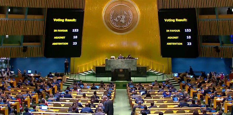 12月12日,聯合國大會通過要求在加薩「立即人道主義停火」的不具約束力決議,共獲得153票贊成、10票反對、23票棄權。圖/取自United Nations臉書