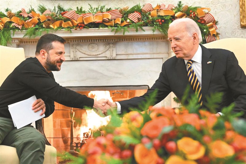 美國總統拜登(右)與烏克蘭總統澤倫斯基(左),十二日在白宮橢圓辦公室會晤時握手。圖/法新社