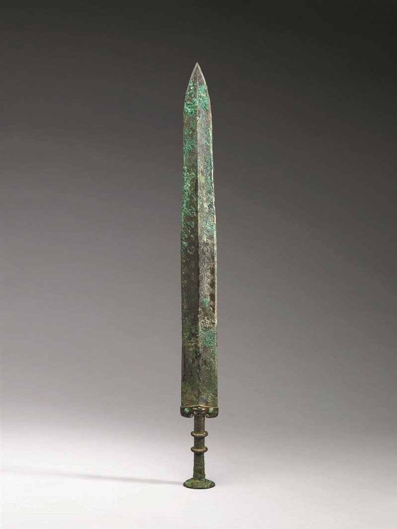 「古代兵器攻略」最大亮點,為〈春秋晚期至戰國 嵌綠松石菱形紋銅劍〉。圖/故宮提供