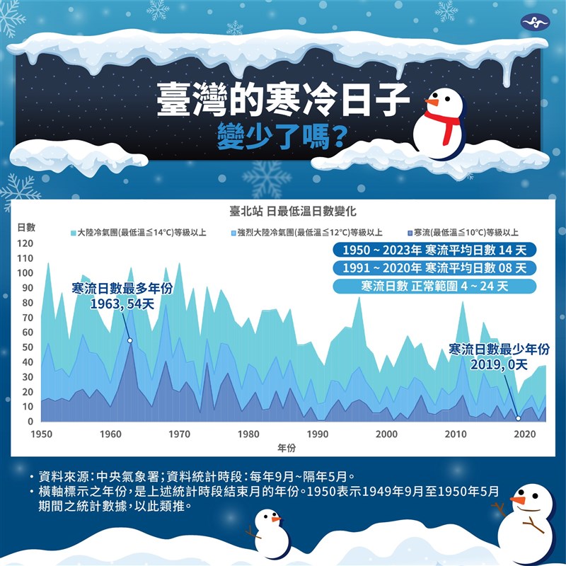 16日降溫溼冷 下周恐還有寒流接力 |2023.12.14 語音朗讀 2922觀看次 字級 大 中 小 16日將有入冬以來最強的極地大陸氣團向東南東移動,且接連有冷空氣南下,降溫一波比一波強,民眾務必做好保暖。圖/資料照片 【本報台北訊】今(14)日上午各地明顯回溫,北部16至30度,中部17至31度,南部19至32度、東部15至30度,白天暖熱如夏,但16日將有入冬以來最強的極地大陸氣團向東南東移動,且接連有冷空氣南下,降溫一波比一波強,民眾務必做好保暖。中央大學大氣科學系兼任副教授吳德榮表示,16日起入冬以來最強的極地大陸(cP)氣團向東南東移動,冷空氣主要侵襲華中以北及日韓,其邊緣仍影響台灣,北台灣氣溫驟降、愈晚愈溼冷,中南部氣溫亦下降,17日北台灣溼冷,中南部白天涼、早晚冷,應注意保暖。吳德榮指出,各國模式如歐(ECMWF)、美(GFS)、日(JMA)模擬略調強,已有大陸冷氣團的強度,並有挑戰強烈大陸冷氣團的機率;北台灣部分都會區的最低氣溫大約可降至12度左右,部分平地最低氣溫則可降至10度左右。天氣風險公司天氣分師柯聿寧指出,中南部16日上半天的天候轉變還不明顯,不過由北到南、下午到晚間溫度也會有較大幅度的下降,深夜低溫也可降至13至15度。圖/中央社柯聿寧說,中南部16日晚到17日雲量較多,可能出現零星短暫雨,預期白天高溫回溫幅度不大,中部約只有18-21度,南部20-23度,降溫都較為明顯,17日深夜到18日清晨,配合輻射冷卻作用中南部仍有13至15度的低溫機會。吳德榮說,18日白天至19日上午有短暫空檔,降雨暫歇、氣溫略升,19日下午起至21日另一股更強的冷空氣抵達,有挑戰入冬第一波寒流的機率,模式模擬持續調整中,應密切觀察,不可小覷。柯聿寧表示,20日下半天水氣減少轉為較乾冷的天氣,低溫在深夜到清晨可再降至11至12度,第二波的強冷空氣約影響至21日深夜到22日凌晨,期間西半部空曠地區低溫也可降至10度或以下;16日起降溫一波比一波強,務必要有保暖的準備。圖/資料照片寒冷日子歷年減少 2019年沒寒流發生現在冬季卻仍出現不少熱如夏的日子,「報氣候 - 中央氣象署」臉書粉專表示,1950至2023年長期平均下來,台灣冬半年發生寒流的天數約14天,不過若以近30年的氣候基期(1991至2020年)平均來看,台灣冬半年發生寒流的日數約為8天,可見近期台灣寒流日數的確有較為減少。「報氣候 - 中央氣象署」表示,統計每年冬半年(9月至隔年5月)的寒流事件,在過去74年(1950至2023)當中,寒流日數最多的年份為1963年(1962年9月至1963年5月期間),共54天,其中有47天集中發生在12月至2月冬天最冷的時段,最少則為2019年,這年的整個冬天都沒有寒流低溫事件發生。「報氣候 - 中央氣象署」分享的圖中也呈現台北日最低溫低於10度、12度和14度(含)以下的日數變化,可以發現1950至2023年間,台灣冬半年極端偏冷的寒流日數隨著年分的增加,有略微減少的趨勢,同時強烈大陸冷氣團及大陸冷氣團的日數也有逐漸減少的趨勢。當有來自北方的冷空氣影響台灣時,將根據台北氣象站的最低溫研判寒冷等級。大陸冷氣團:12度<最低溫≦14度;強烈大陸冷氣團:10度<最低溫≦12度;寒流:最低溫≦10度。圖/報氣候 - 中央氣象署FB 前一篇文章 避免壞膽固醇過高 用這些方法護心 下一篇文章 中職/本來要投陳俊秀當隊長 廖健富:變空氣了 熱門新聞 01星雲大師全集⑳【佛教管理學②】佛教的「梵唄音樂」管理學⑥2026.01.1102台南林鳳營 落羽松花海2026.01.1303金球獎提摩西夏勒梅封帝 蘿絲拜恩摘后2026.01.1304香港佛光道場 獲十大最高義工時數獎2026.01.1305野森動物學校 17日試營運2026.01.1306武士僧帽水母 現蹤2026.01.1207瑕疵品反爆紅 哭哭馬賣到缺貨2026.01.1408福山寺贈吉祥公益米 送暖彰化社區2026.01.1209澳洲野火延燒 吞噬30萬公頃叢林2026.01.1210【 父母親的話】一拐一拐領著學生跑步2026.01.12 訂閱電子報 台北市 天氣預報 台灣一週天氣預報 相關報導 歷來最大手筆 台積今年資本支出 將逾500億美元台電技能競賽 1281名好手展技蔣經國逝世38周年 鄭麗文頭寮謁陵顧立雄:斷續收到墜海F-16黑盒子訊號搜救F-16飛官 海巡艦艇未發現油汙社宅跳票 擬助37.5萬空屋出租