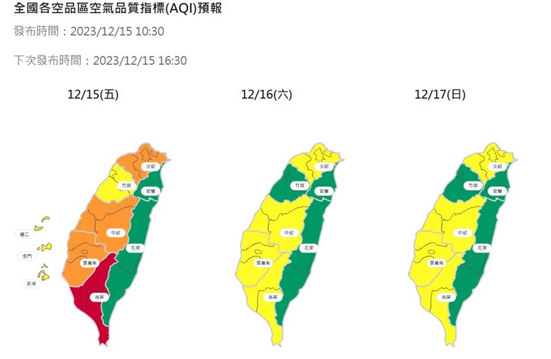 宜蘭、花東空品區為「良好」等級;竹苗空品區及馬祖、金門、澎湖為「普通」等級;北部、中部、雲嘉南空品區為「橘色提醒」等級,西半部局部地區短時間可能達紅色警示等級;高屏空品區為「紅色警示」等級。