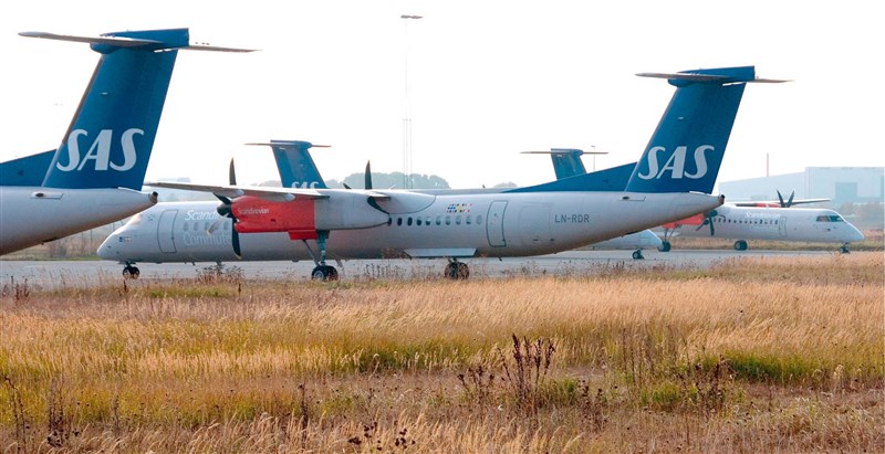 丹麥政府將對搭機旅客開徵綠色稅,供航空業綠色轉型之用;圖為已停飛「北歐航空」Q400客機。圖/美聯社