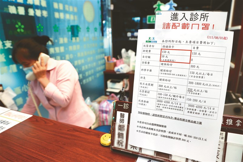 診所掛號費150元的年代恐怕要成為過去,據調查,今年六都醫療院所共有375家調漲掛號費,調漲的診所表示,健保點值縮水威脅營運,是掛號費調漲的關鍵原因。圖為診所掛號收費示意圖。圖/曾吉松