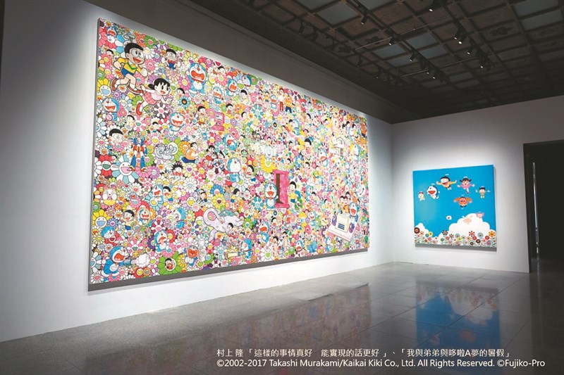 「THE哆啦A夢展」即起開展,圖為村上隆〈這樣的事情真好 能實現的話更好〉和〈我與弟弟與哆啦A夢的暑假〉。