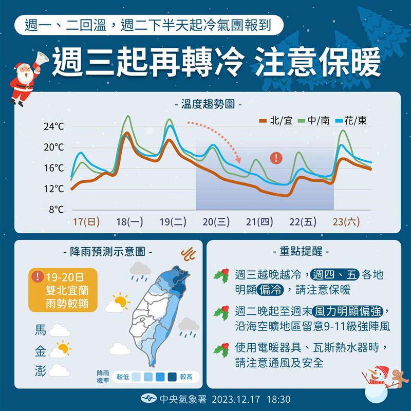 賈新興表示,19日中午後至25日,新竹以北及宜蘭整天偏冷,要注意保暖。使用熱水器要通風,使用電熱器要注意安全。