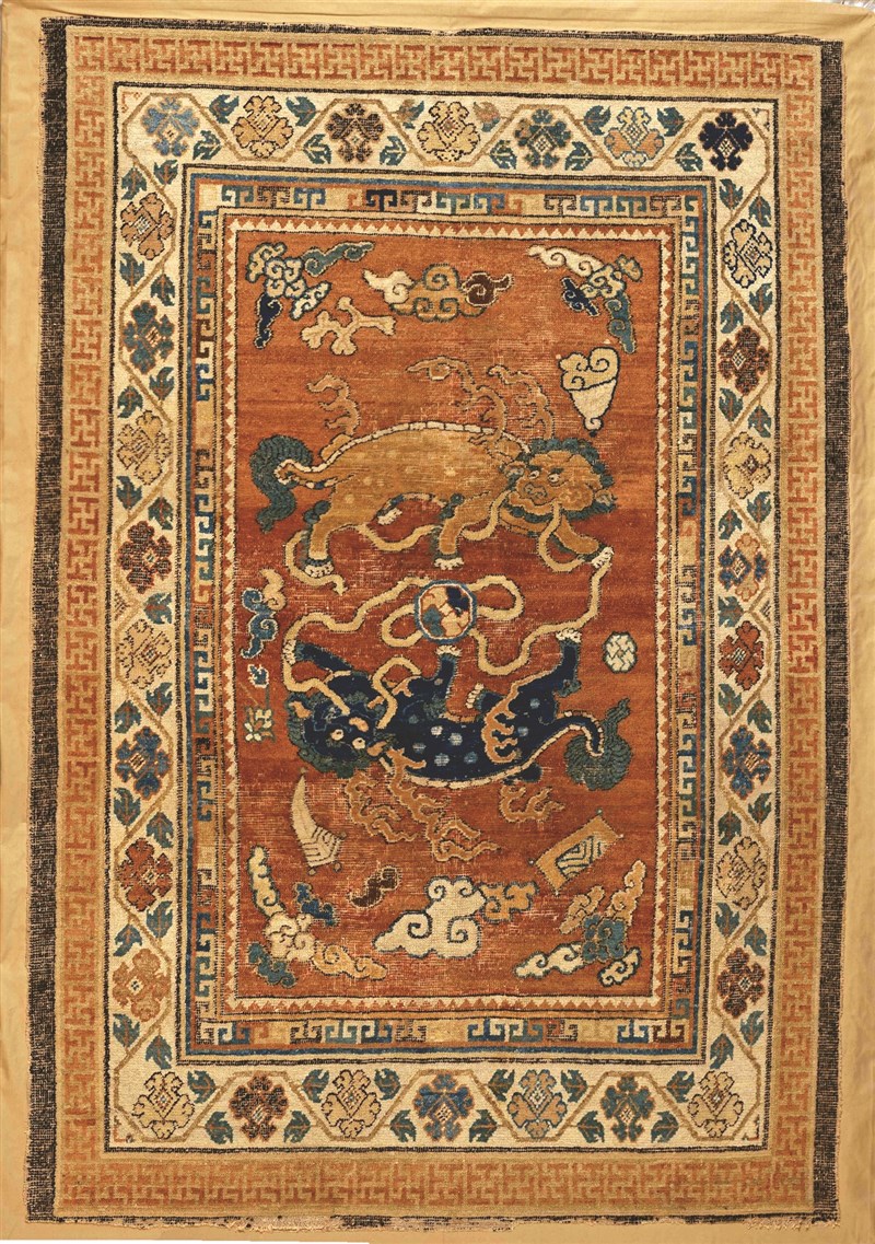 〈雙獅戲球紋毯〉是以手工編結方式製作的羊毛地毯,毯面上有兩隻玩著繡球、口啣彩帶的獅子,而「獅」與古代高級官員「太師」音近,也隱含官運亨通、榮華富貴之意。