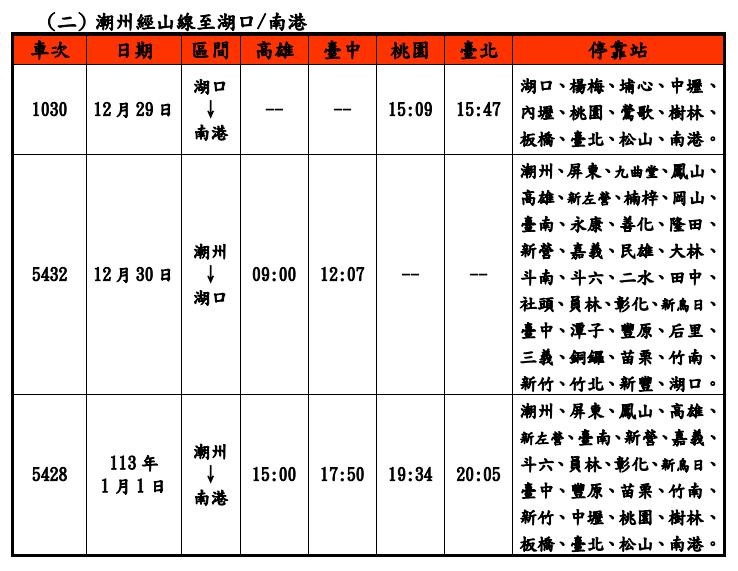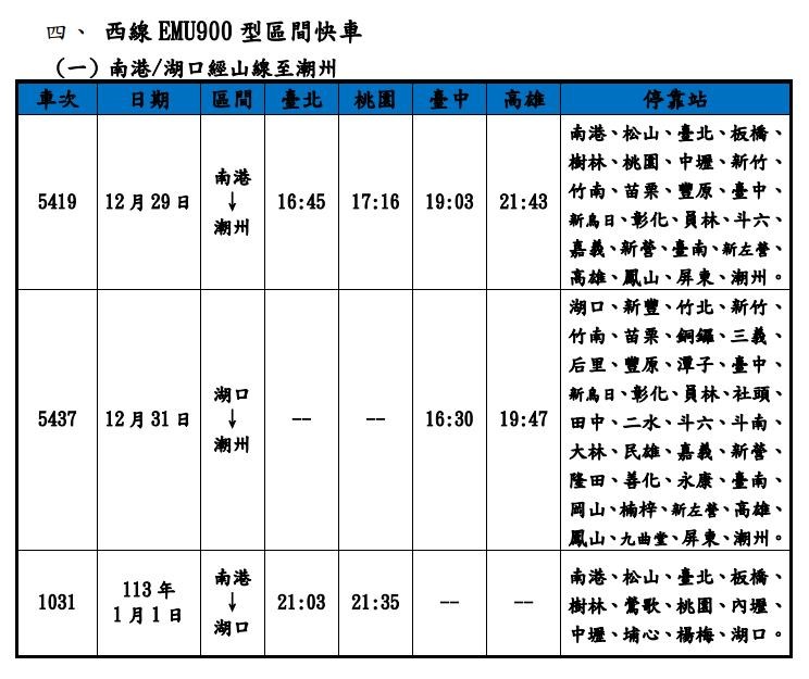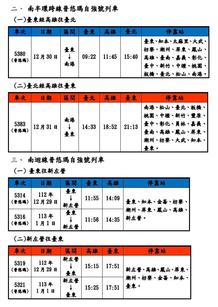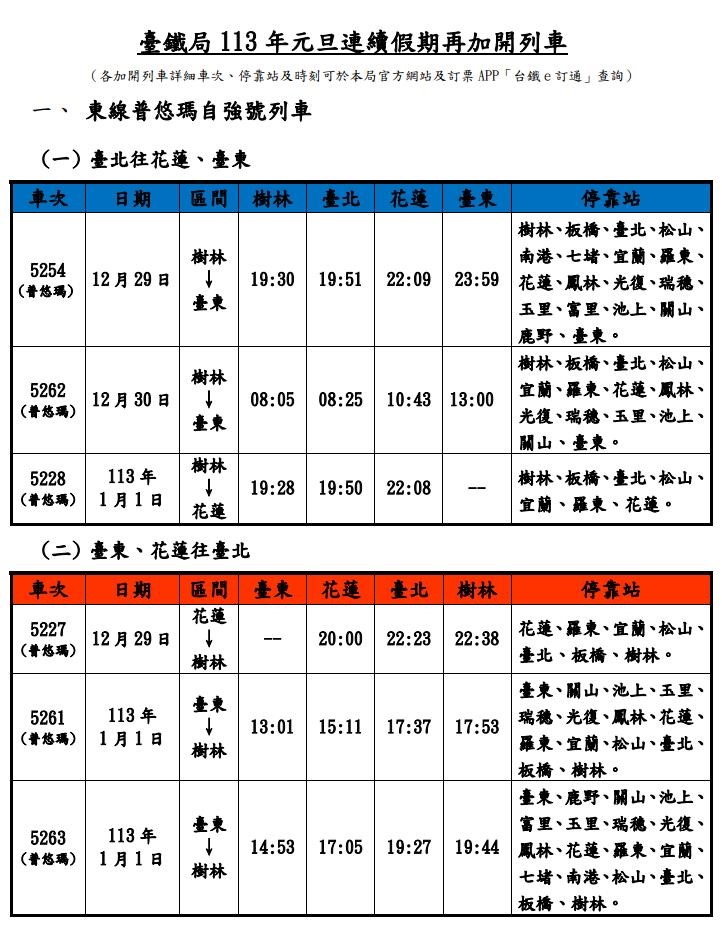 2024元旦假期疏運 台鐵加開列車21日0時開放訂票 |2023.12.19 語音朗讀 325觀看次 字級 大 中 小 圖/資料照 【本報台北訊】元旦連假將至,台鐵局今天宣布,今年12月29日至2024年1月1日,再加開東線6列次、台東經高雄往台北、台北經高雄往臺東南半環跨線各1列次、南迴線4列次普悠瑪自強號列車及西線EMU900型區間快車6列次,合計18列次。另外,配合各地政府跨年晚會活動,北中南東區皆加開凌晨列車,共計24列次,疏運散場旅客。台鐵局表示,本次加開對號列車於今年12月21日0時起,開放網路、台鐵e訂通、超商及電話語音訂票,相關加開列車車次時刻,可於台鐵局官網及訂票App「台鐵e訂通」查詢。圖/台鐵局提供圖/台鐵局提供圖/台鐵局提供圖/台鐵局提供 前一篇文章 新聞千里眼 下一篇文章 冷氣團來襲 農糧署提醒:盡速採取農作物防寒 熱門新聞 01【寬鼎畫語】 看不見的真相2025.11.1002補充纖維、鈣、鎂、鉀 預防多種疾病風險2025.11.1103南天健康日 身心靈課程吸引社區民眾2025.11.1004鳳凰撲台 今明北東雨量恐紫爆 2025.11.1005巴黎佛光人 重陽敬老長幼同樂2025.11.1006COP30揭幕 關注氣候人權與森林2025.11.1007星雲大師全集【經義】佛法滿人間—佛法滿人間 常不輕2025.11.1008星雲大師全集【經義】佛法滿人間—佛法滿人間 悲智雙運2025.11.1009巨型蔬果牆 行銷中台灣2025.11.1010人間佛教聯合總會 推人間佛教國際化2025.11.10 訂閱電子報 台北市 天氣預報 台灣一週天氣預報 相關報導 涵管便道拚10天搶通 馬太鞍溪左岸 將建600公尺長堤芬普尼毒蛋 又爆4萬顆流入市面嘉明湖步道 恢復開放射箭亞錦賽 戴宇軒、李彩綺混雙摘金馬太鞍溪溢流 國軍、機具助清淤司馬庫斯美景 觀光署肯定