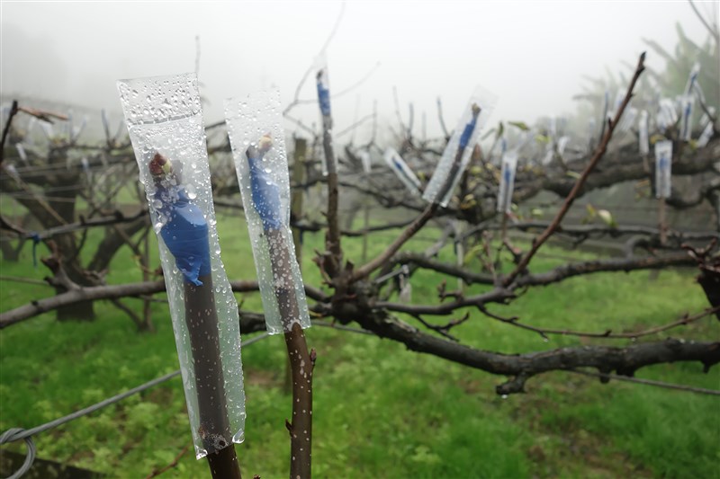 農糧署提醒,剛嫁接的高接梨穗易受寒害,更應留意氣溫狀況妥適防護,可以於嫁接或開花行人工授粉後套上塑膠袋以防寒風。圖/農糧署提供