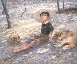 出了街道走過阡陌縱橫的郊外,傍著菜畦門口有株芒果樹的茅草竹厝到了。路邊樹下,蹲了個田家漢,腳旁一副空米籮,不知為何悲傷哭泣,肩膀顫顫不停。