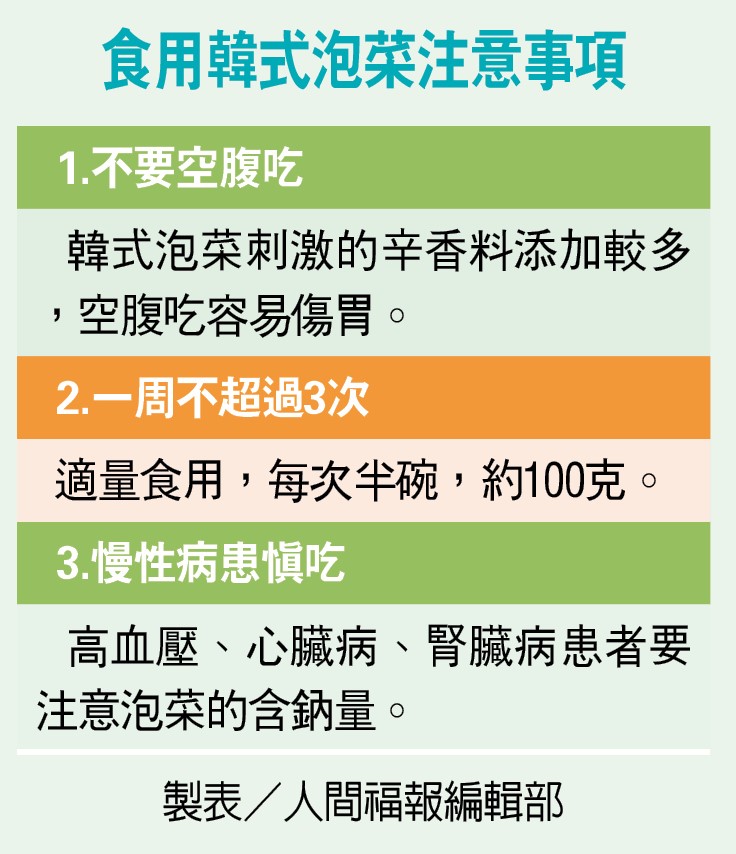韓式泡菜富含乳酸菌 有益腸道增強免疫力 |2023.12.21 語音朗讀 2215觀看次 字級 大 中 小 韓式泡菜是利用發酵而成,是富含乳酸菌的一種健康食物。圖/123RF 【本報台北訊】韓式泡菜常見於各種美食,是韓式料理、台式小吃的靈魂角色。常吃泡菜到底好不好?研究發現,醃漬物容易導致癌症,可是透過發酵製成的韓式泡菜,反而有助腸道健康,降低慢性病發生。康寧醫院營養師陳詩婷表示,吃韓式泡菜有助腸道健康、促進血液循環等4大好處。1.有益腸道健康與台式與日式的醃漬泡菜不同,韓式泡菜是利用發酵而成,是富含乳酸菌的一種健康食物。研究發現,發酵後的韓式泡菜每公克約有107~109 CFU/g(菌數形成單位),台灣相關規定,每罐乳酸、發酵乳等含菌量都需大於或等於107 CFU/ml,可見發酵後的泡菜乳酸菌含量和優酪乳相當。研究進一步指出,這些乳酸菌在辣椒、生薑等又辣又嗆的調味料還能活下來,代表其對人體消化液具有很強的抵抗力,比較能夠存活在腸子裡。乳酸菌對身體的好處相當多,包括促進腸道健康、增強免疫力、降低身體反應等,而且透過「競爭性抑制」作用,可減少壞菌在腸道生長的數量;乳酸菌產乳酸的特性,不利壞菌生存,又更進一步降低壞菌數量。2.有助身體抗氧化韓式泡菜作法是將清洗後的白菜、黃瓜、蘿蔔等天然食材,加入大量的辣椒、薑等辛香料搗成泥,再加進各種蔬果,特別是十字花科蔬菜,與蘋果、水梨、糯米粥等至少15種材料下去進行攪拌混合,在常溫下讓其自然發酵,或額外添加乳酸菌製成。因此韓式泡菜富含許多天然植化素,如胡蘿蔔素、辣椒素、槲皮素、葉綠素、葉黃素、有機硫化物等,而這些植化素有助對抗自由基、抗氧化,甚至能互相作用,促進維生素B群及維生素C的吸收。食用韓式泡菜注意事項。製表/人間福報編輯部3.活性化合物有助減脂罹患高血壓、高血脂、心臟病、冠狀動脈硬化等問題,罪魁禍首就是壞的膽固醇啟動血小板作用,黏附在血管導致。研究發現,適量吃天然發酵之韓式泡菜,因其含有一種獨特,名為fHDMPPA的活性化合物,可抑制低密度脂蛋白氧化,也就是所謂的壞的膽固醇,間接減少動脈粥狀硬化問題。4.促進血液循環因為韓式泡菜添加高量的辣椒、薑等辛香料,能促進胃液分泌、幫助消化、止吐,還有助幫助血液循環,加快脂肪在體內燃燒的速度。但需注意的是,儘管辛香料有非常多好處,大量食用反而會傷害胃,使胃酸分泌過多,並破壞神經末稍的感覺,所以要適量使用。另外,有些人因聽說常吃醃漬物會致癌,擔憂吃韓式泡菜也會。對此,陳詩婷表示,韓國人罹患胃癌的比例高,很多人將常吃泡菜與胃癌聯想,事實上,韓式泡菜是以發酵方法製成,不會有醃漬物常見的致癌物亞硝酸鹽及硝酸鹽,故不會有致癌的疑慮。研究發現,韓國人之所以胃癌比例高,與他們食用泡菜,配燒酒、飲用熱湯、炸物有關。 前一篇文章 6旬男換肺重生 三總首例雙肺移植成功 下一篇文章 洗腎發生率 我5年來首降 熱門新聞 01渥太華佛光山 授海狸童軍領巾2025.11.1702【詩】遊園地.競馬場2025.11.1703警告日本 陸黃海軍演、籲暫勿遊日 2025.11.1604墨西哥熱氣球節 高空爭豔2025.11.1605芬普尼毒蛋 又爆4萬顆流入市面2025.11.1606落葉刺繡 巴西百鳥寫真集2025.11.1707克林姆富家女肖像畫 估值46億元2025.11.1708【快樂塗鴉簿】熱鬧的內灣小鎮2025.11.1709AMR機器人 是什麼?2025.11.1710中日緊張 陸4海警船巡航釣魚台2025.11.17 訂閱電子報 台北市 天氣預報 台灣一週天氣預報 相關報導 暖身加收操 避免天冷運動傷害小雪時節避風防寒 黑色食物溫補養腎5天然護胃食材 緩解胃脹、胃痛壓力大蕁麻疹易上身 改善飲食作息防發作少糖多運動 穩定睪固酮改善疲態多吃蔬食少糖少油炸 營養均衡啟動代謝力