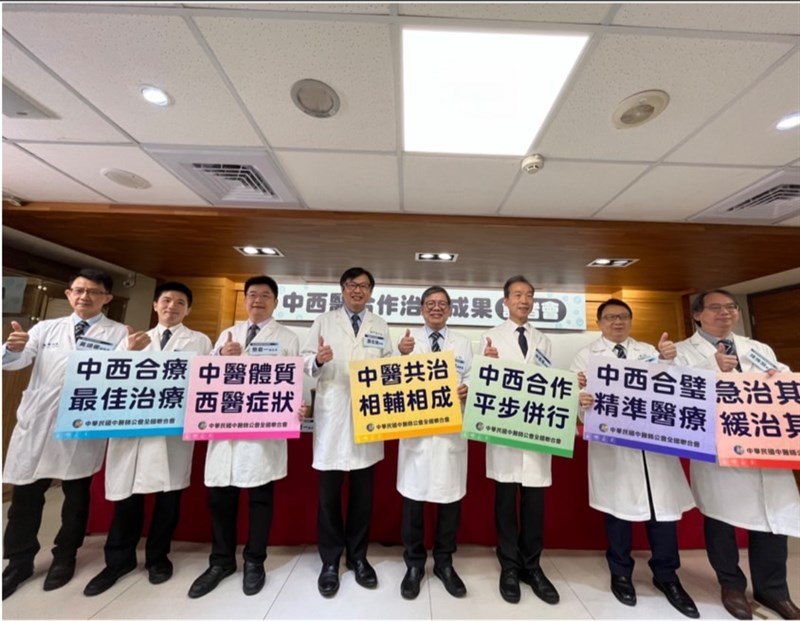 中國醫藥大學中醫學院院長暨附設醫院中西醫結合科主任顏宏融(左4),出席中醫師公會主辦「中西醫合作治療成果」記者會。圖/中醫師公會全聯會提供