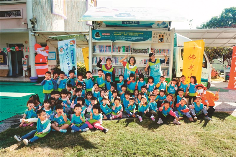 佛光山南華大學圖書館重啟雲水書車,前進嘉義偏鄉校園,將逾萬本童書分批送入幼兒園、小學。圖/南華大學提供