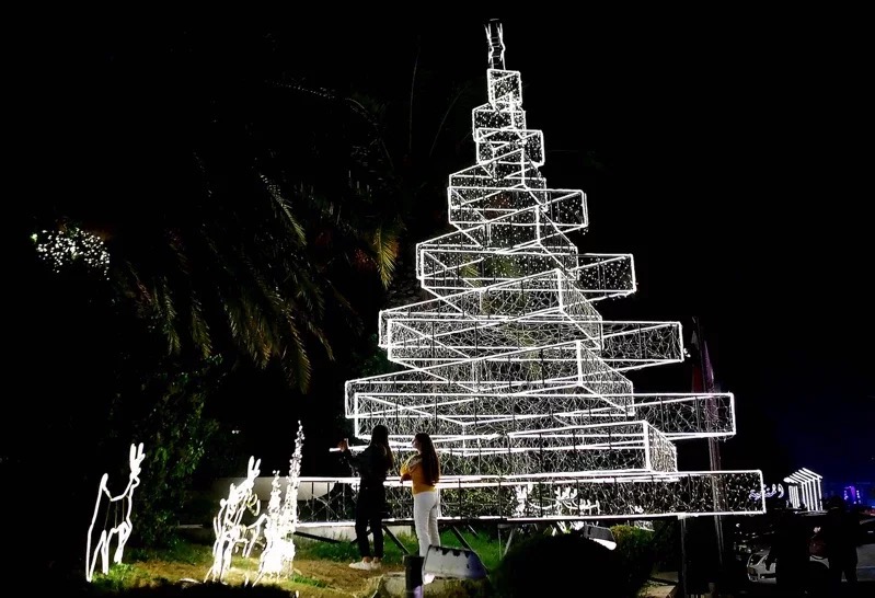 為聲援在加薩(Gaza)遭受戰爭之苦的巴勒斯坦人,敘利亞各城市的街道上今天聽不到耶誕節的歡樂聲,各大教堂的慶祝活動僅限於禱告。圖為人們在敘利亞大馬士革觀看節慶裝飾品。圖/新華社